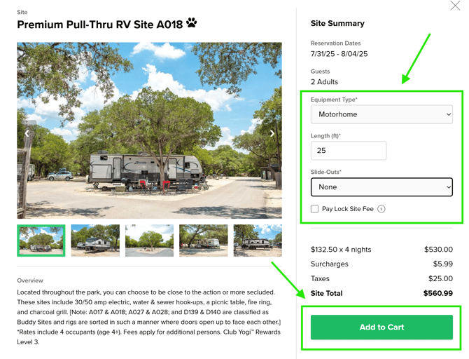 • Choose the site to reserve and enter any RV equipment information (if required).