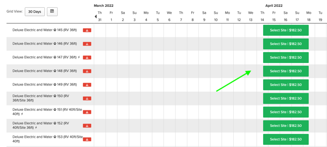 • After searching, the Reservation Grid will display available sites matching your criteria.