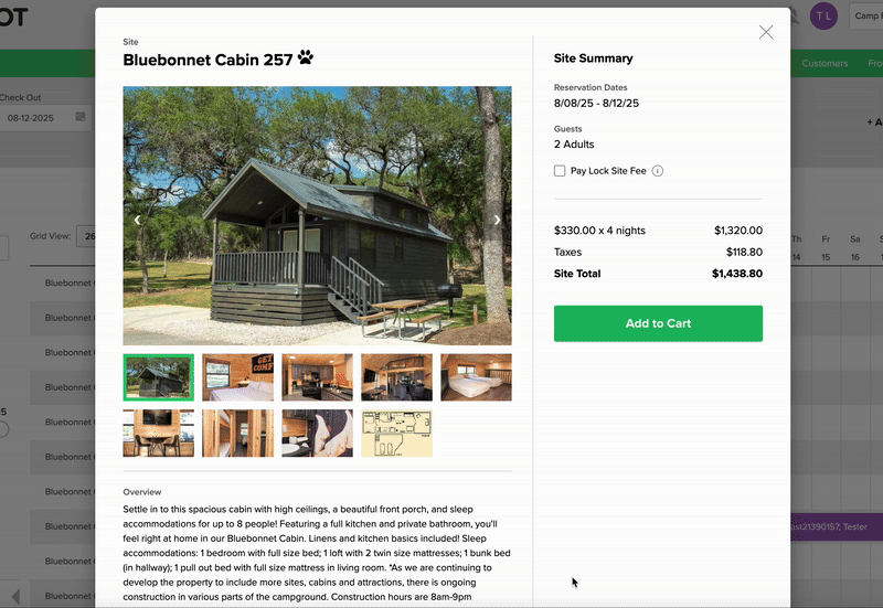 To add another site to the reservation, click the X in the top-right corner of the Site Summary modal. This will return you to the Reservation Grid.