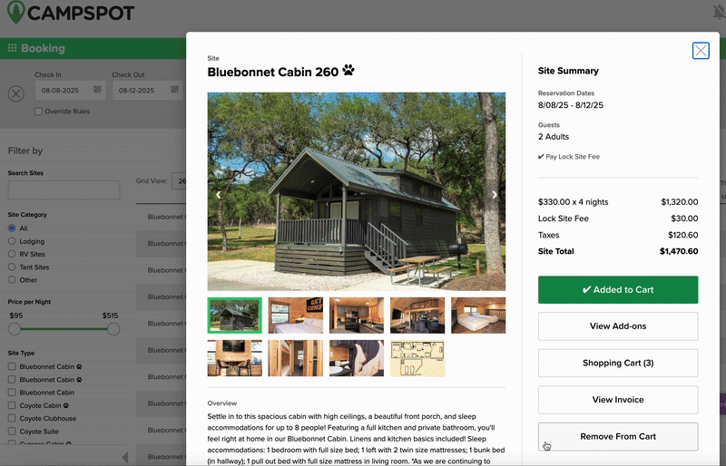 • Flexible site selection: Guests can choose different sites for different dates, or multiple sites for the same dates.