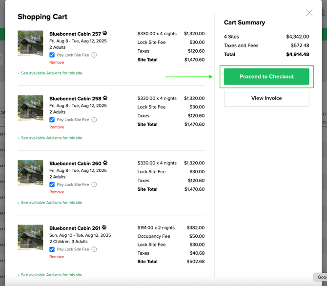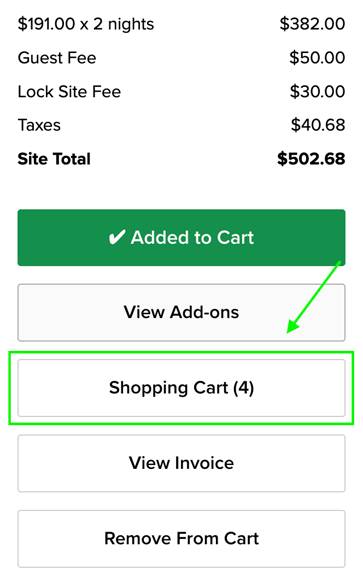 • All sites must be fully paid before any individual site can be checked out—even if they have different departure dates.
