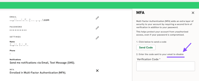 To disable MFA, follow the same steps as you would to enable MFA (shown above). If it is enabled, you will notice the word "disable" at number 2 in the MFA modal. Refer to the image below.